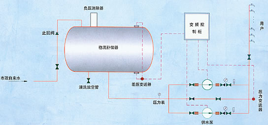 第二阶段是采用“储水池+水泵+压力罐”的方法,市政来水进入储水池,然后由水泵加压后送至压力罐,由压力罐向用户供水,蓄水池起到高峰用水时调节作用;